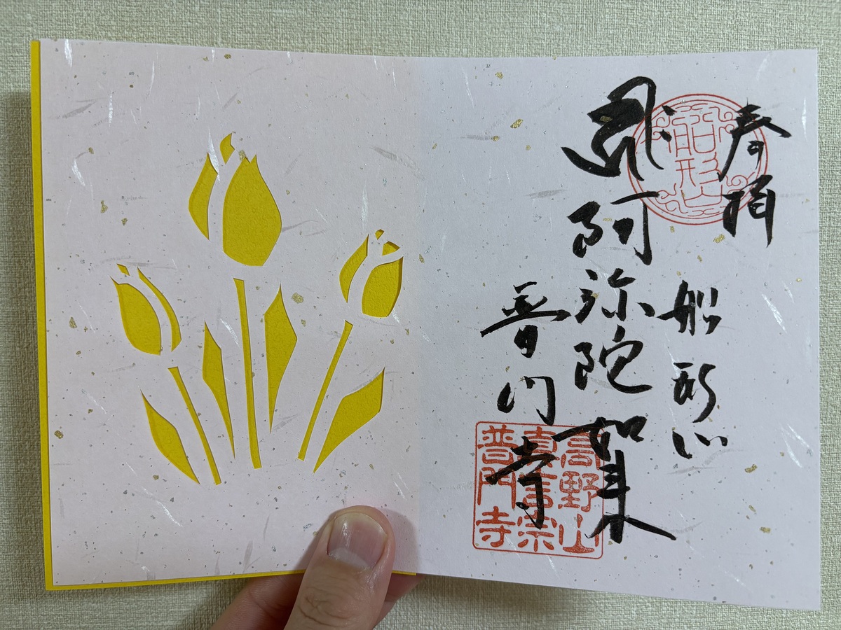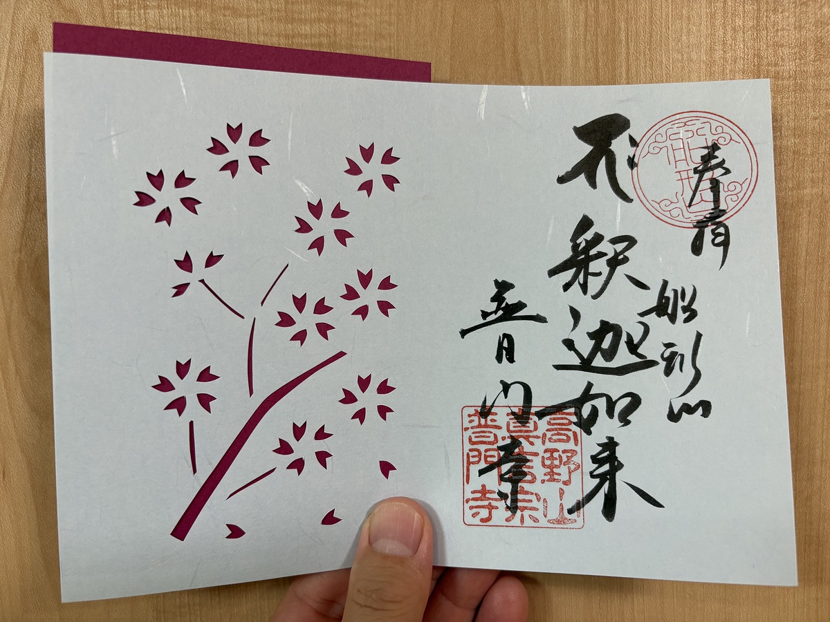 先代住職が、高野山の縁起物「宝来」を模して御朱印紙を手切りしてます。月替わりで「切り絵御朱印」授与しています。